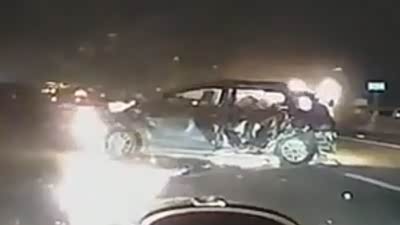 现场一片火海 高速路实拍两车相撞起火