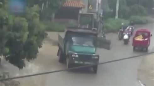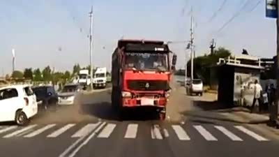 难以置信 卡车不慎甩开尾门撞倒骑车人