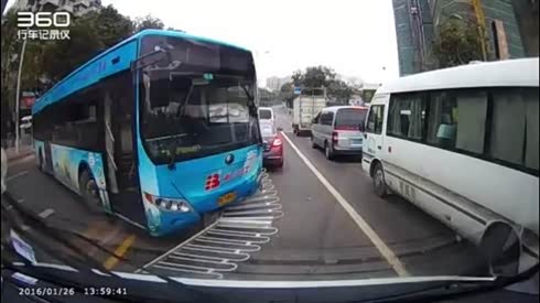 公交车失控 摄像车留足车距而幸免被撞