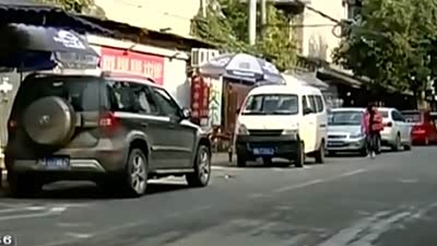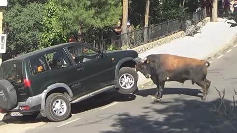 水箱都漏了 愤怒的公牛街头怒怼越野车