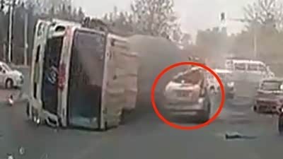欲速则不达 实拍大货车侧翻压扁轿车