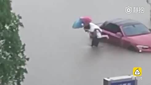 父爱如山 宝马女雨中被淹父亲背其脱困