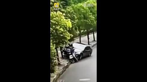 轿车猛撞电动车 当场撞飞司机又撞断树