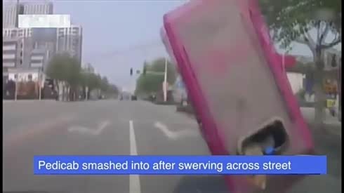 瞬间成铁皮 超载大货车侧翻压扁小三轮