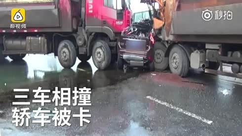触目惊心 轿车遭两大货车夹扁车毁人亡