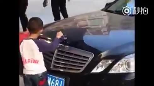 家长怎么教育的?熊孩子玩弄奔驰车标