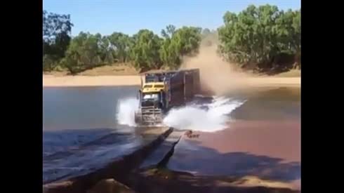 真的很过瘾 大型拖挂卡车疯狂过浮桥