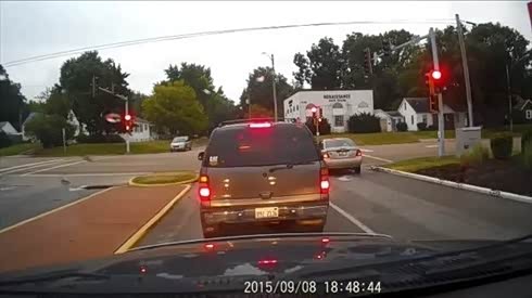 监控实拍:三轮车横穿马路 SUV紧急躲避险翻车