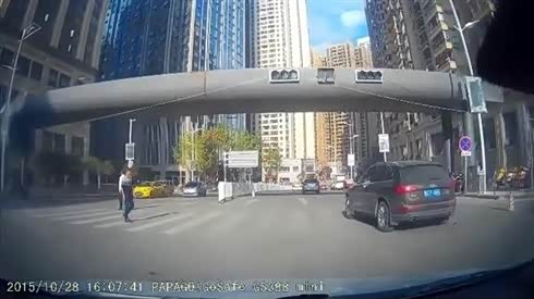 这碰瓷看的也醉了 路中间华丽转身坐上车盖