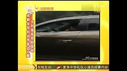 女司机边开车边拿麦K歌 微笑与对面车司机互动