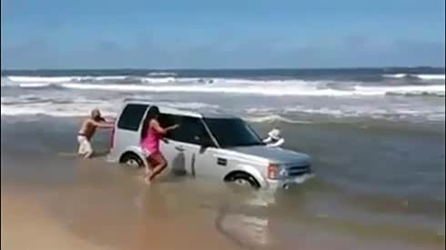 路虎发现深陷沙滩 还得靠丰田陆巡救援