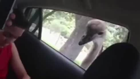 动物不好惹 车内实拍鸵鸟隔窗抢东西