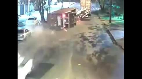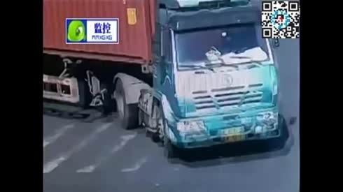 监控实拍:吓尿了 面包车毫厘之差 躲过货柜车侧翻压顶之灾