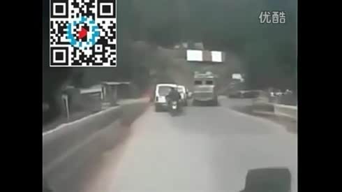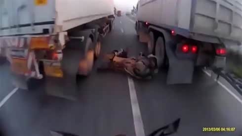 这是玩命啊!摩托骑士在大货车之间穿梭 差一点丧命...