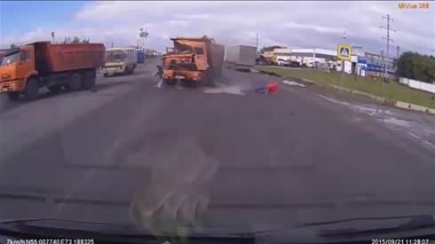 监控实拍:老外穿行马路 被疾驶重卡撞飞