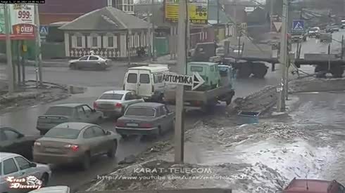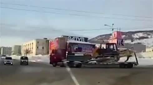 监控实拍:恐怖!大板车转弯侧翻 推土机滑落险砸中小车...