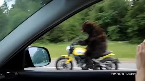 公路惊现狗熊骑摩托 还跟美女打招呼!