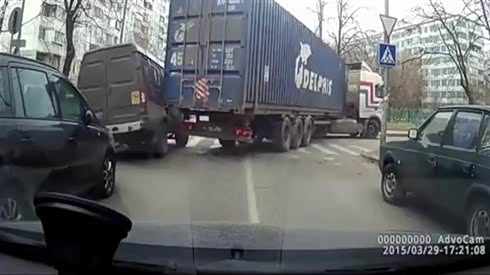监控实拍:大货柜车转弯 霸气带走面包车...