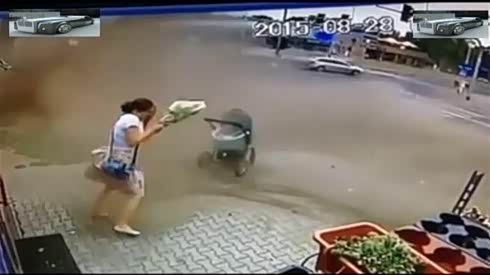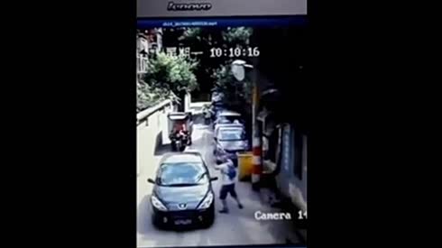 监控实拍:小车突然失控 路边行走的母子险被卷飞...