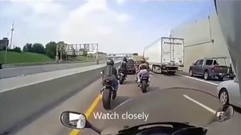 监控实拍:太玩命!载人摩托手超车失败 被大卡车卷入车底...