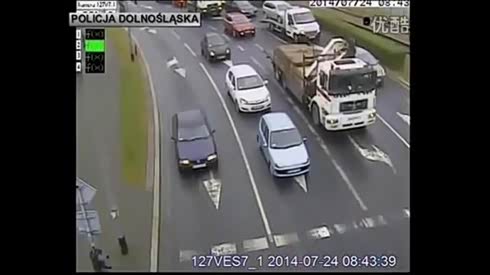 监控实拍:与大货车抢道 车毁人遭殃...太恐怖了