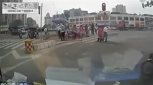 监控实拍:三轮车转弯失控 环卫工惨遭撞飞 幸运生还,,,