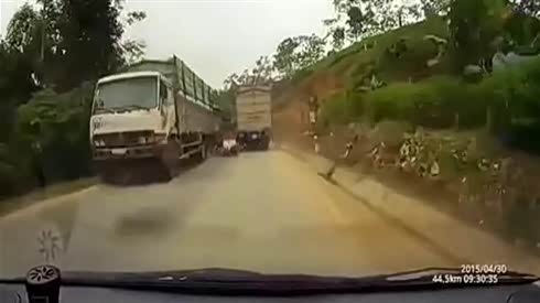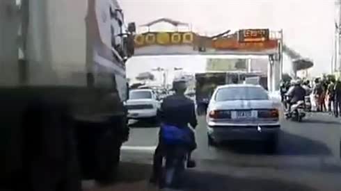 监控实拍:太恐怖!摩托车夫妇 两大货车夹缝中捡了条命...