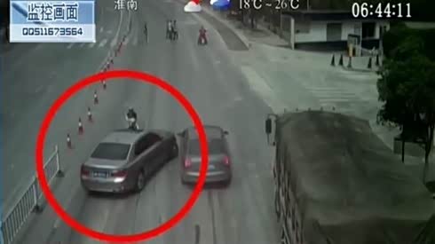 监控实拍:霸气女司机 驾越野车“骑”轿车车顶 飞进隔离带...
