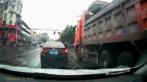 监控实拍:电动车闯红灯 与大货车抢行 车轮下捡了一条命...