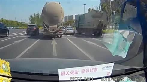 监控实拍:转弯不减速 小车与大货车相撞 致大货车轮胎爆炸...