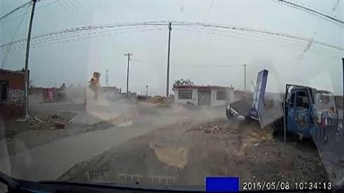 监控实拍:两大货车夹缝中穿行 电车男女这是捡条了命...
