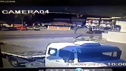 重摔倒地不起 监拍女子骑摩托过路口被面包车撞飞