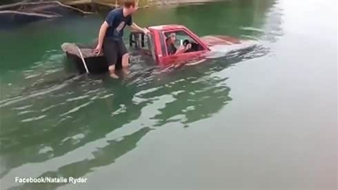 实拍:帅呆了!新西兰两男子 竟开车通过深水河...