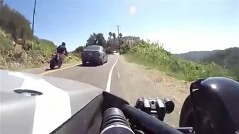 监控实拍:摩托手弯道飙车 突遇小车挡路 杯具了,,,