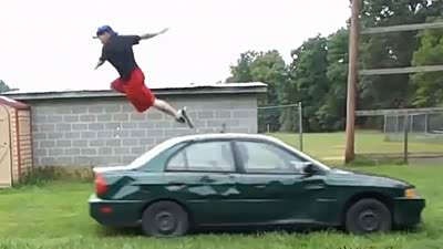 切勿模仿 国外男跳跃时速32km/h汽车