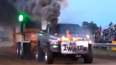 太卖命了!改装皮卡拖拽铲车机舱起火