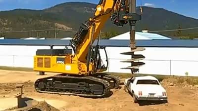 压倒性的威力 大型钻机轻松摧毁汽车