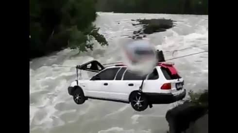 好办法!SUV挂在索道上飞过湍急河流