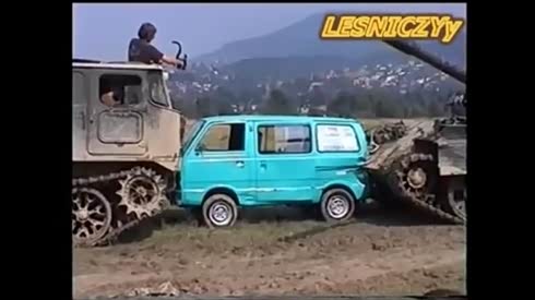 尽情的蹂躏! 两辆坦克残忍挤扁面包车