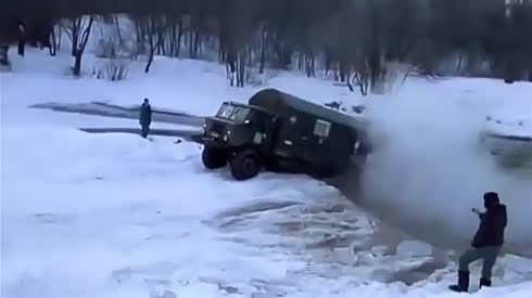 太尴尬了 实拍俄罗斯军车水坑中被困