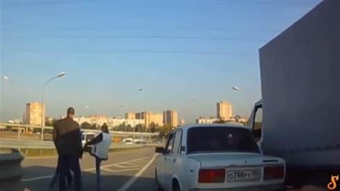 监控实拍:路怒三打一!被打司机上车后 怒撞卡车 卡车穷追不舍