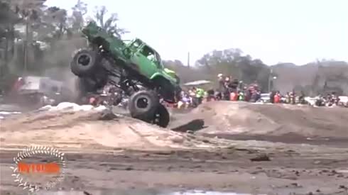 人仰马翻 实拍大脚车飞坡时不幸翻车