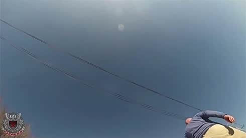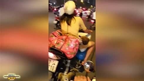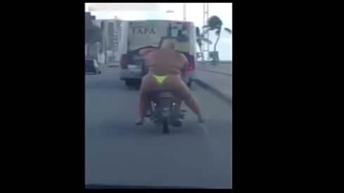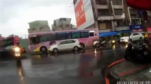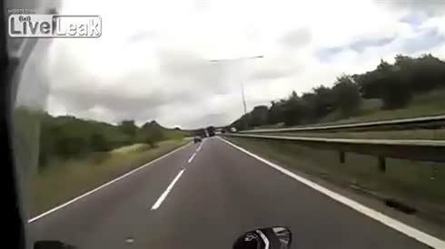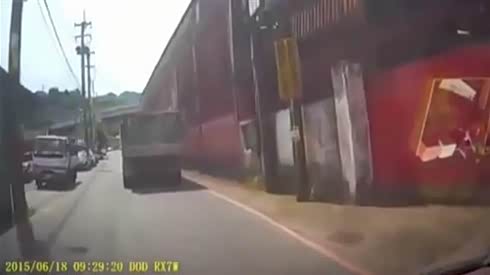 吓尿了 摩托车两卡车夹缝中穿行 被夹惨