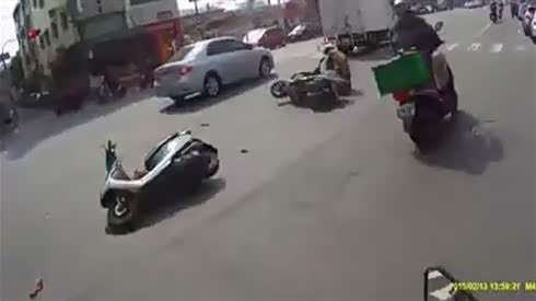 监控实拍:十字路口 小车闯灯撞飞三辆电动车...