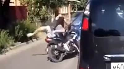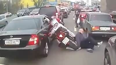 就不能慢点吗 摩托暴力起步被轿车惨撞