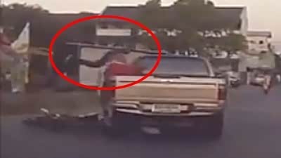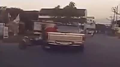 路口多留神 摩托撞皮卡驾驶员翻进车斗