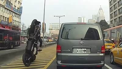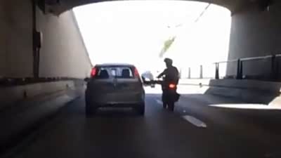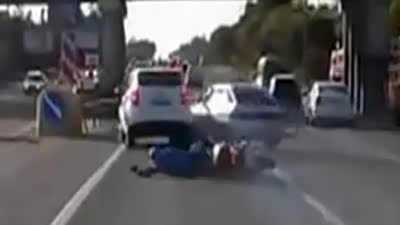 自作自受 摩托司机怒踹汽车后滑稽摔倒