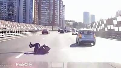 摔得够疼的 摩托躲避来车急刹当场翻倒