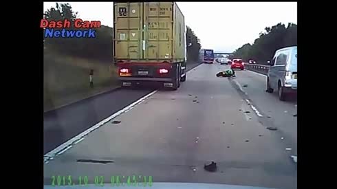 幸运生还 摩托车被货车夹击重摔在地