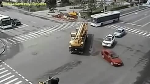 大吊车撞向闯灯的公交车 速度太快 撞惨了
